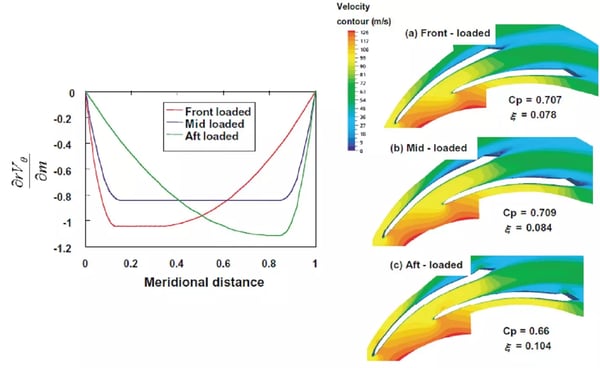A parametric study of the diffuser loading distribution by CFD, as shown in fig.3, demonstrates the advantages of a fore-loaded diffuser for diffuser performance. This study indicates that the pressure rise should be accomplished in the front part of the diffuser rather than in the rear part. This is because the effect of flow separation is larger in the rear part of the diffuser vane.