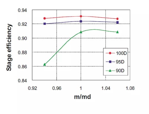 The effect of the compact design on the diffuser performance was analysed by using CFD, as shown in fig.4. In this design, each diffuser was designed using the front-loaded loading distribution as shown in fig.3. The diffuser exit absolute circumferential velocity was set the same as the original 100D diffuser. This result shows that the diffuser performance of the 90D diffuser dropped significantly at 94% design flow rate (m/md=0.94) caused by a large separation in the diffuser channel. In the case of the 95D diffuser, diffuser performance at m/md=0.94 is still compatible with the original 100D diffuser.