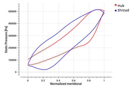 The first step is the optimization of the impeller, ADT’s optimization software TURBOdesign Optima is used. TD1 performance parameters such as secondary flow factor and profile losses are used as objectives, while cavitation and diffusion parameters are used as constraints. An optimized impeller design with a modified blade loading, meridional geometry and trailing edge stacking is obtained. This optimization that relies on speed of computations in TURBOdesign1 and yet accuracy of surface static pressure can explore a large design space in less than an hour on a single core processor. The TD1 blade loading comparison is shown in Figure 2 where it can be seen that the new design has a fore-loaded shroud and aft-loaded hub. This helps in reducing the secondary flow losses as well as profile losses in the impeller, consequently improving the efficiency. A matching volute is designed and the stage is simulated using CFD. These modifications together produced an efficiency gain of ~2% points. This is followed by a study of the effect of volute splitter thickness.